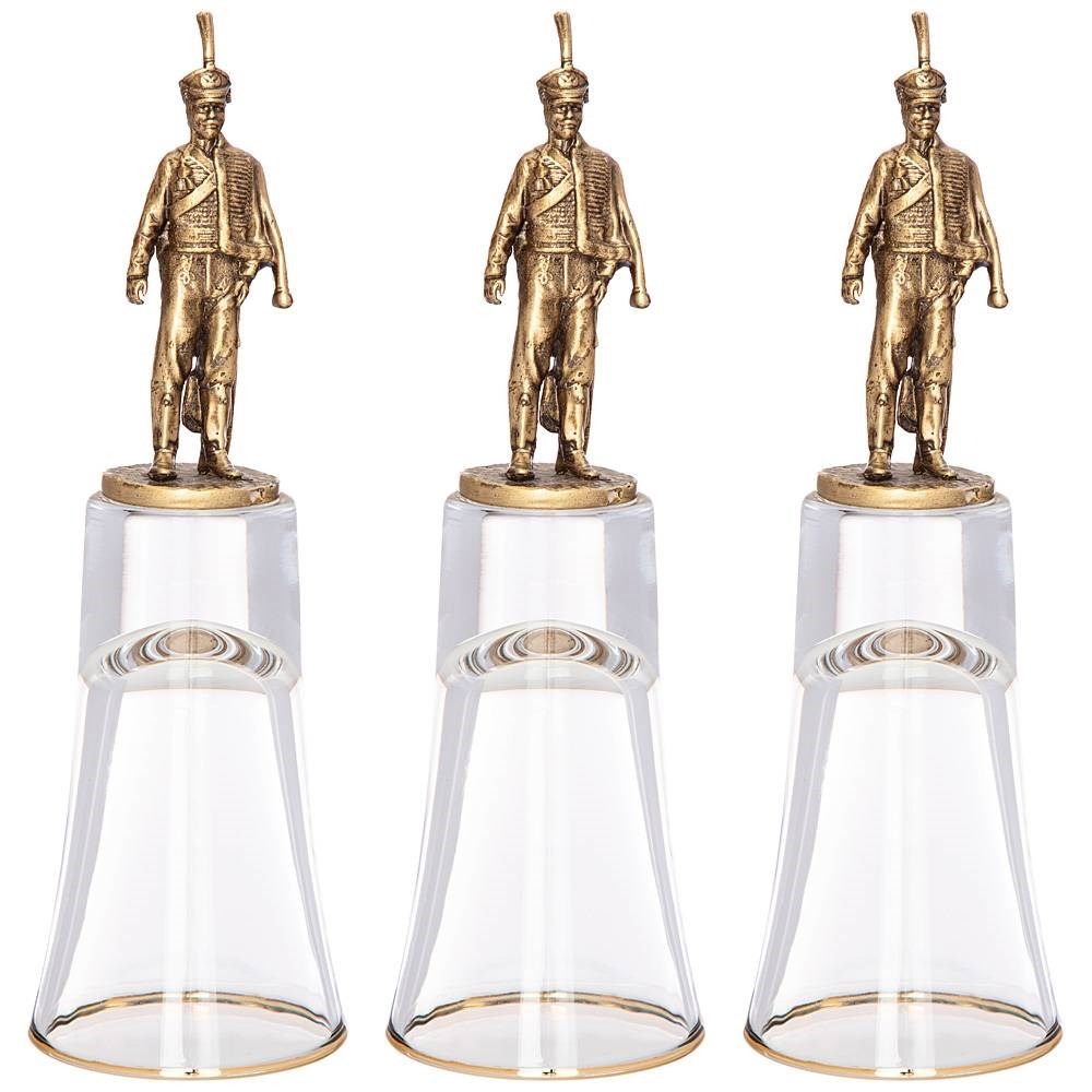 Уникальный набор из трех стопок-перевертышей, каждая из которых украшена бронзовой фигуркой храброго гусара. Фигурка выполнена методом художественного литья. Ручная работа мастера тонок передает мельчайшие детали композиции – китель, шляпу с пером, кокардой, саблю, сапоги. Стопки элегантно смотрятся на синем ложементе из шелка в дизайнерской коробке.