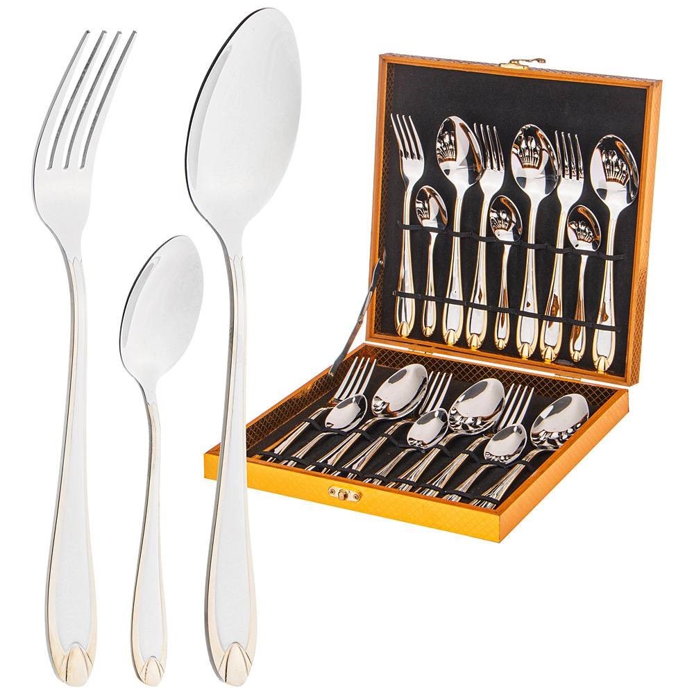 Набор состоит из из 18пр. - 6 столовых ложек, 6 столовых вилок, 6 чайных ложек. Набор идет в подарочном деревянном кейсе, который также подойдет для дальнейшего хранения столовый приборов.