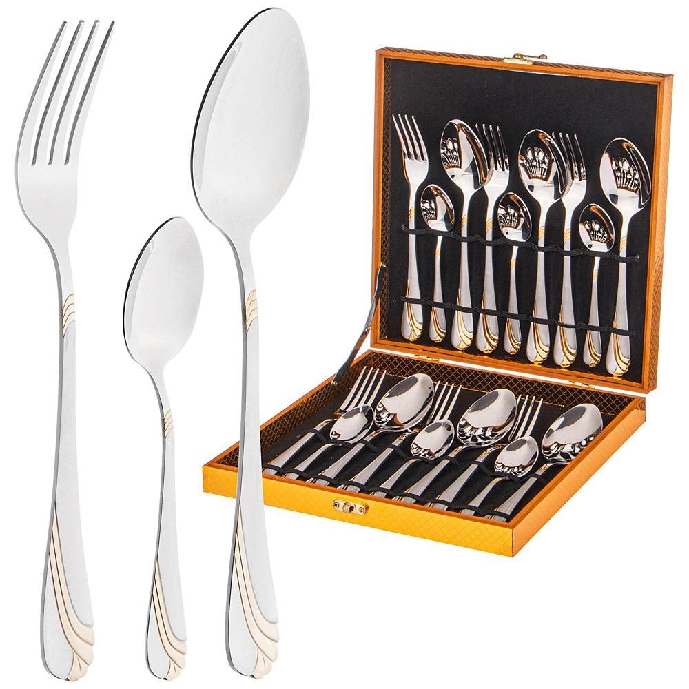 Набор состоит из из 18пр. - 6 столовых ложек, 6 столовых вилок, 6 чайных ложек. Набор идет в подарочном деревянном кейсе, который также подойдет для дальнейшего хранения столовый приборов.