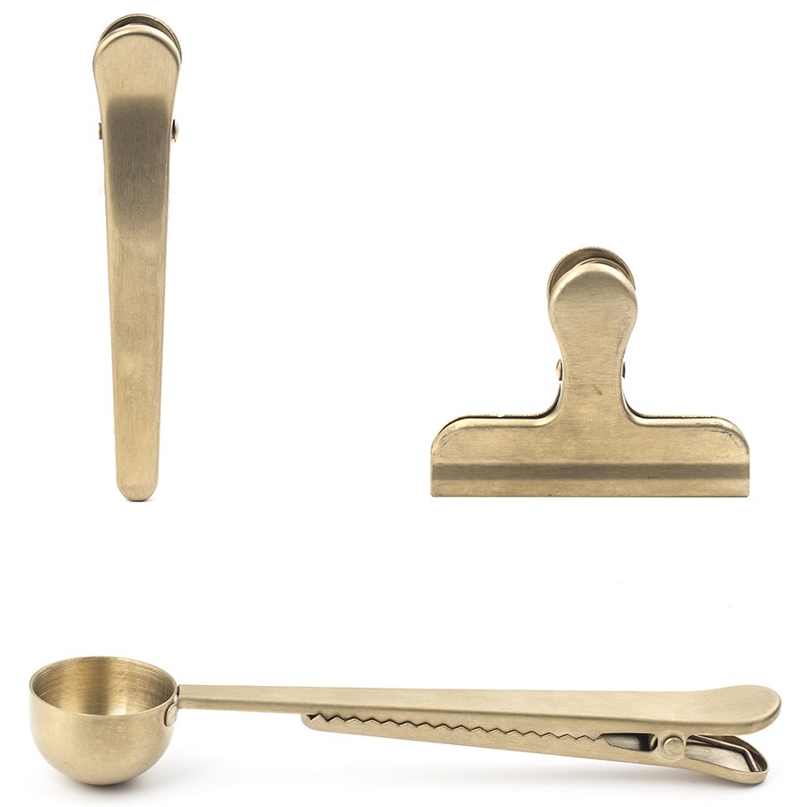 Набор включает зажим в ретро дизайне, глубокую ложку с прищепкой, которая отлично подойдет для кофе и зажим типа "аллигатор". Изделия выполнены из нержавеющей стали с латунным покрытием.