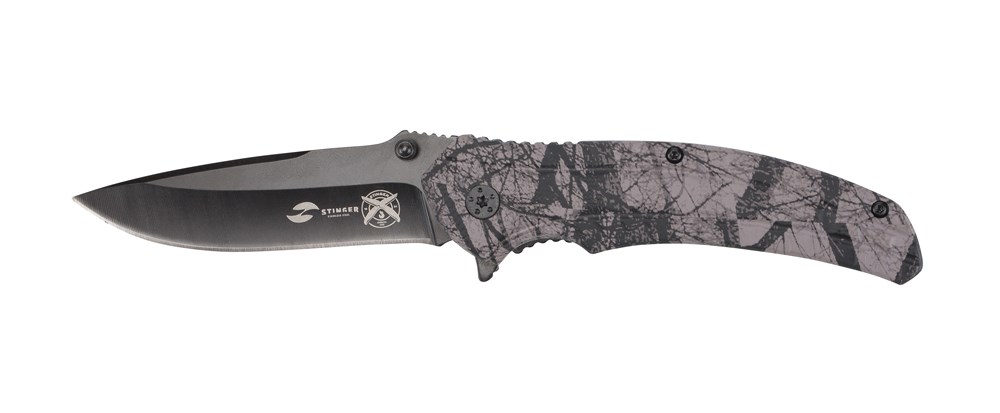 Нож складной Stinger, 84 мм длина лезвия (черный), рукоять: алюминий (черный камуфляж с древесным узором), картонная коробка