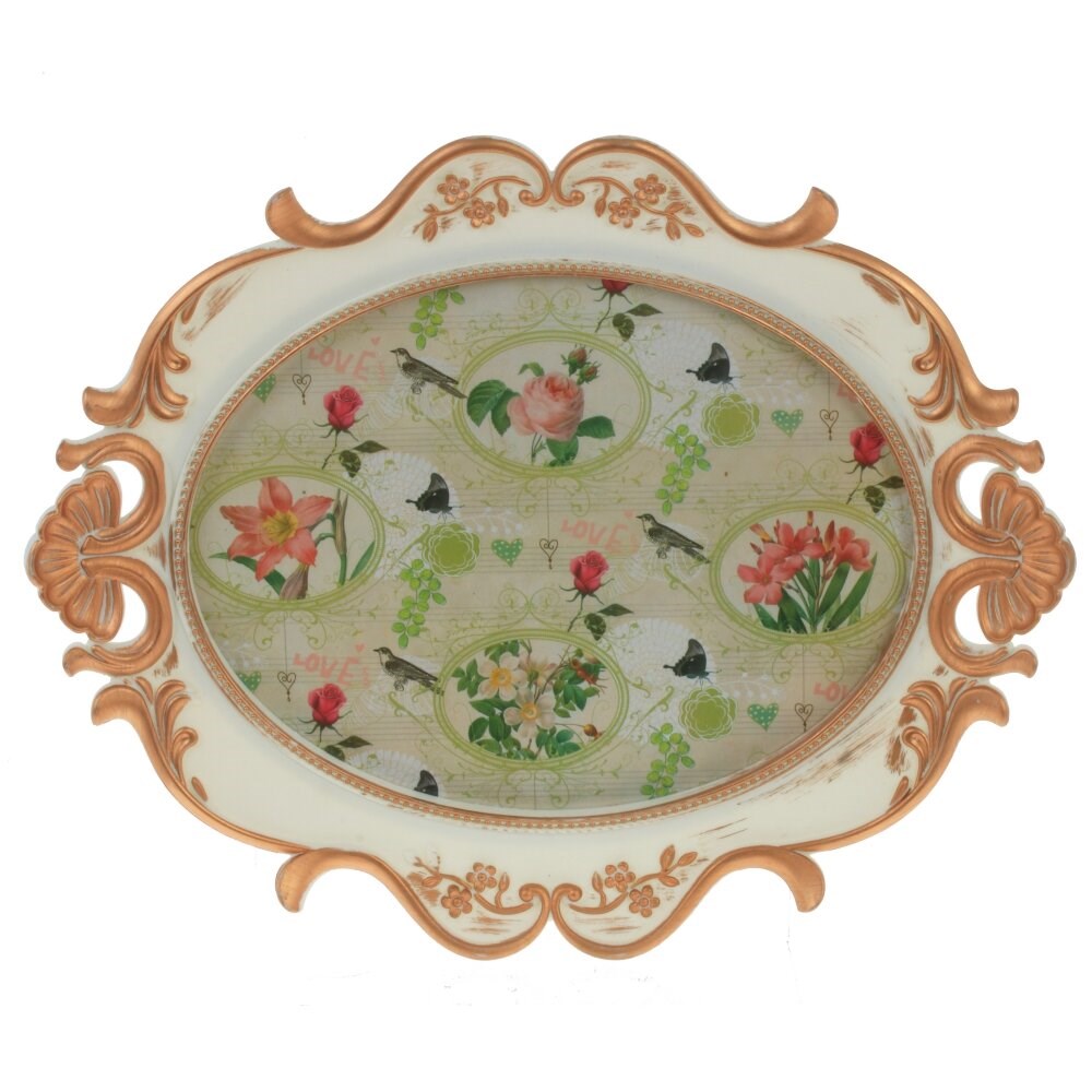 Потрясающий поднос овальной формы с двумя ручками, оформленный цветочным декором. Форма и стильный декор делает его прекрасным дополнением интерьера. А в качестве подарка, несомненно, порадует любую женщину.
