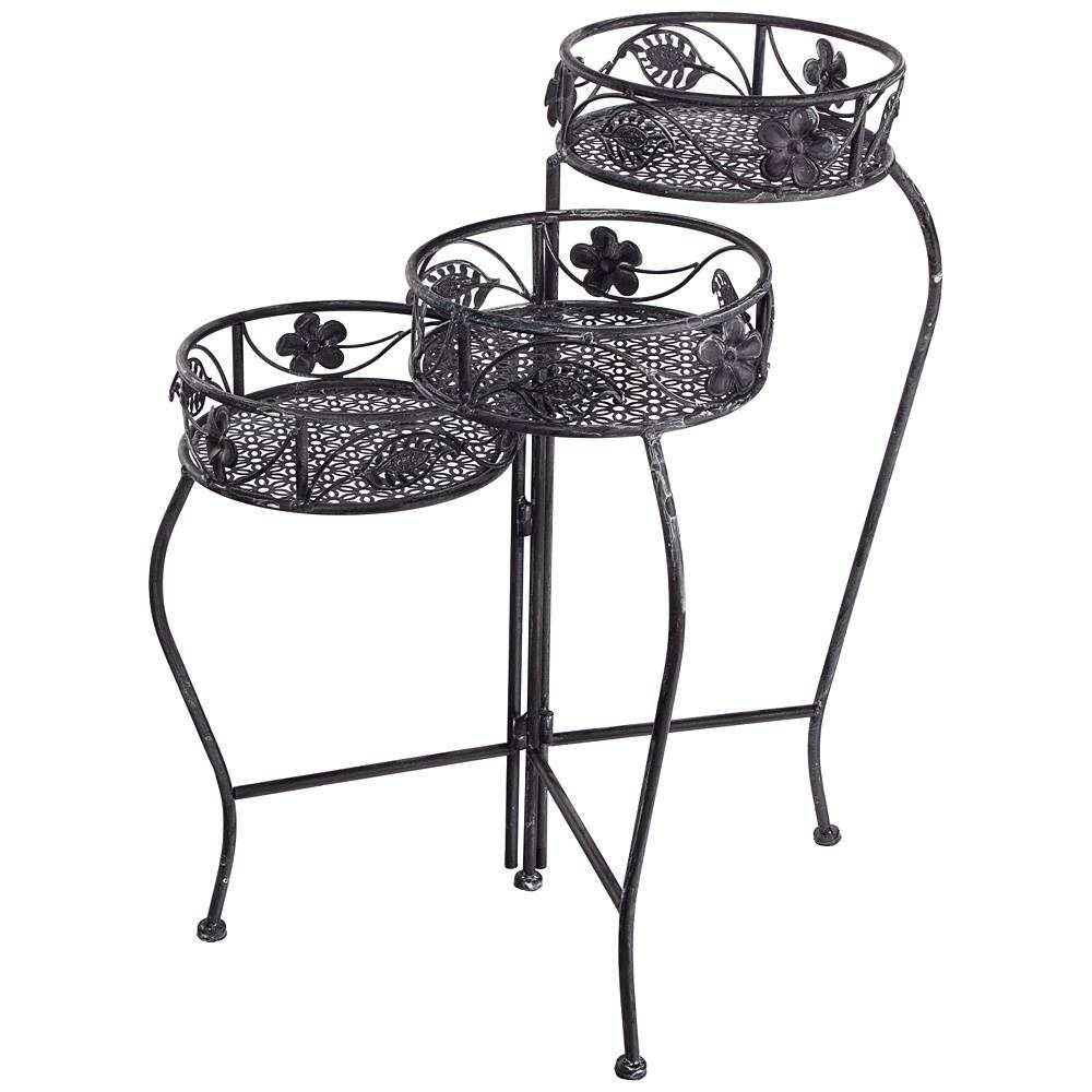 Подставка изготовлена из металла, что обеспечивает прочность и долговечность изделия. Она имеет три уровня, каждый из которых может использоваться для размещения любимых цветов или растений. Высота конструкции составляет 65 см, ширина и длина – 23 см. Размер такой компактной тройной подставки позволяет её удобно располагать в помещении.