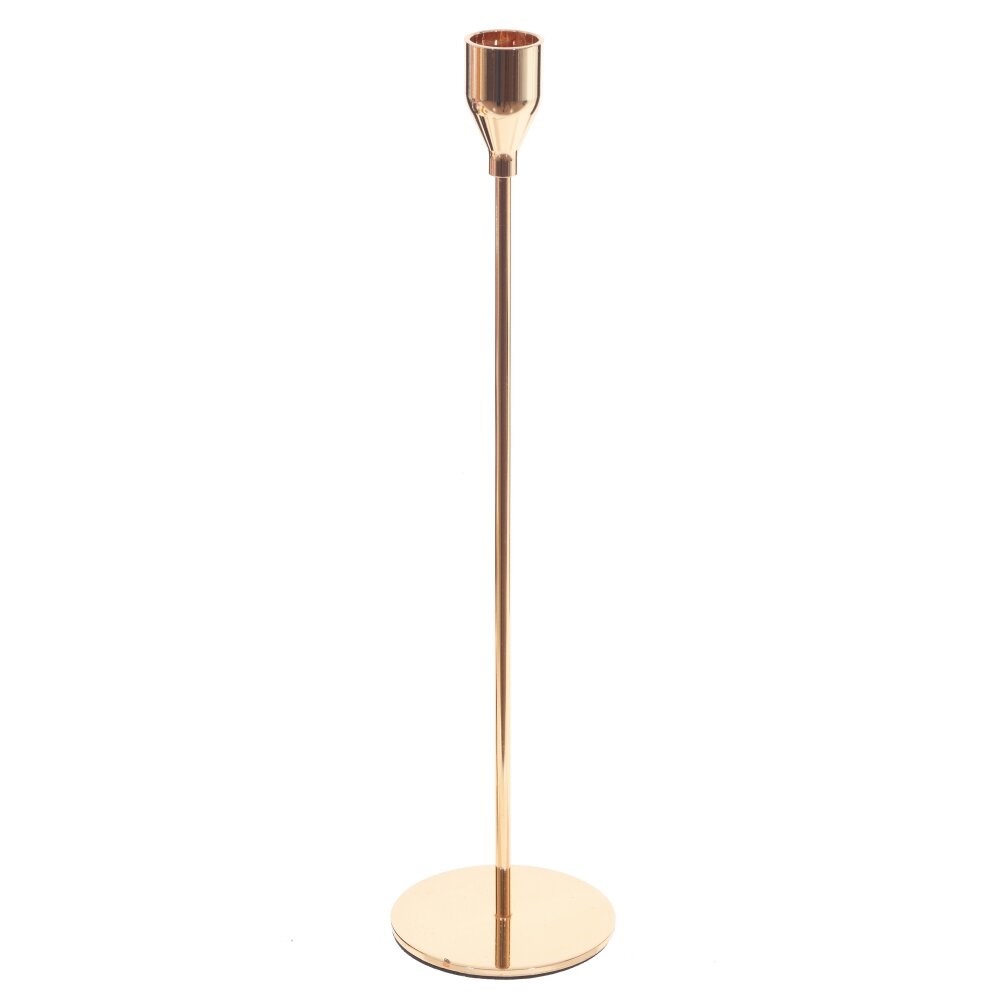 Оригинальный и изысканный металлический подсвечник для одной свечи золотого цвета на ножке позволит украсить интерьер Вашего дома. С таким элементом декора ужин при свечах наполнится торжественной и праздничной атмосферой. А также станет отличным подарком для ваших близких и друзей. Диаметр свечи 2.5 см
