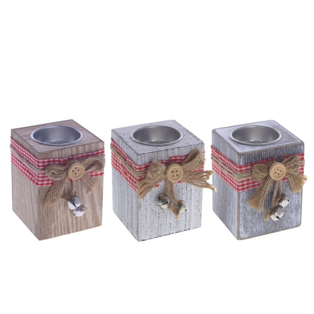 Подсвечник прямоугольной формы изготовлен из дерева с декором в виде тесьмы и колокольчиков. Представлен в трех вариантах.