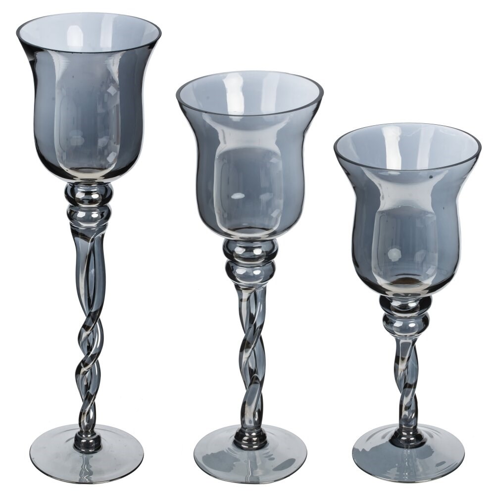 Набор из трех оригинальных стеклянных подсвечников на высоких ножках - прекрасный аксессуар для оформления праздничного стола. Он дополнит сервировку стола, подойдет для романтического вечера, или, просто украсит ваш дом.