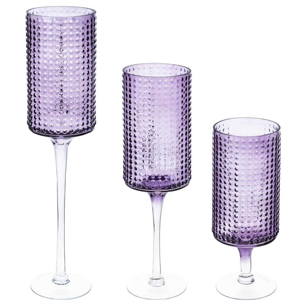 Набор из трех оригинальных стеклянных подсвечников на высоких ножках - прекрасный аксессуар для оформления праздничного стола. Он дополнит сервировку стола, подойдет для романтического вечера, или, просто украсит ваш дом.