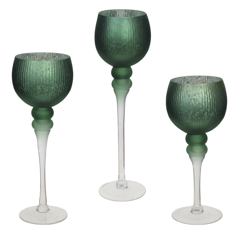 Набор из трех оригинальных стеклянных подсвечников на высоких ножках - прекрасный аксессуар для оформления праздничного стола. Он дополнит сервировку стола, подойдет для романтического вечера, или, просто украсит ваш дом.