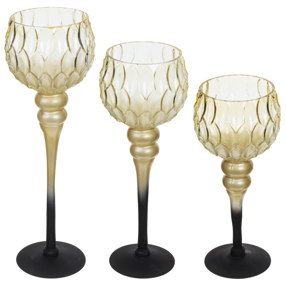 Набор из трех оригинальных стеклянных подсвечников на высоких ножках - прекрасный аксессуар для оформления праздничного стола. Он дополнит сервировку стола, подойдет для романтического вечера, или, просто украсит ваш дом.