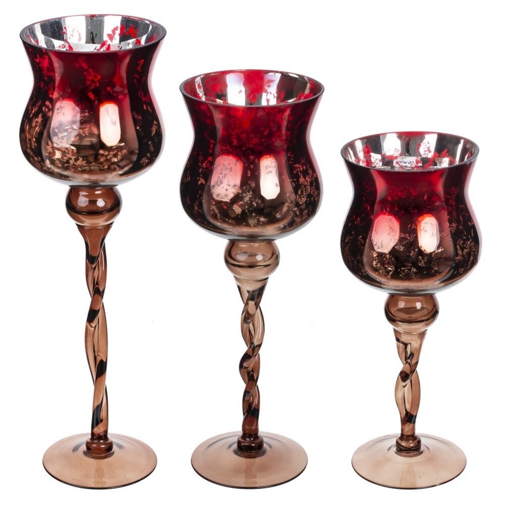 Набор из трех оригинальных стеклянных подсвечников на высоких ножках - прекрасный аксессуар для оформления праздничного стола. Он дополнит сервировку стола, подойдет для романтического вечера, или, просто украсит ваш дом.