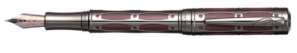 Ручка перьевая Pierre Cardin THE ONE. Корпус и колпачок - латунь и пушечная сталь. Отделка и детали дизайна - фигурная оправа корпуса из пушечной стали, гравировка гильош. Завинчивающийся колпачок. Перо - BOCK, нержавеющая сталь с позолотой, среднее. Цвет - пушечная сталь и красный. Упаковка L.