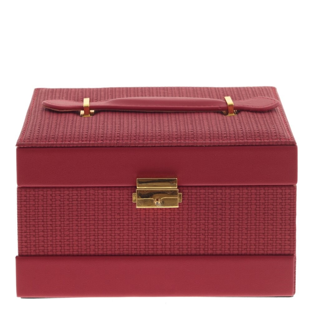 Шкатулка с автоматическим механизмом. На внутренней стороне крышки зеркало. Верхний уровень разделен на три секции, одна из которых с валиками для колец. Средний уровень - на четыре секции. Нижний уровень - выдвижной, для крупных украшений или бумаг. Замок надежный и автоматический, изготовлен из нержавеющей стали, мягкая ручка для удобства транспортировки.
