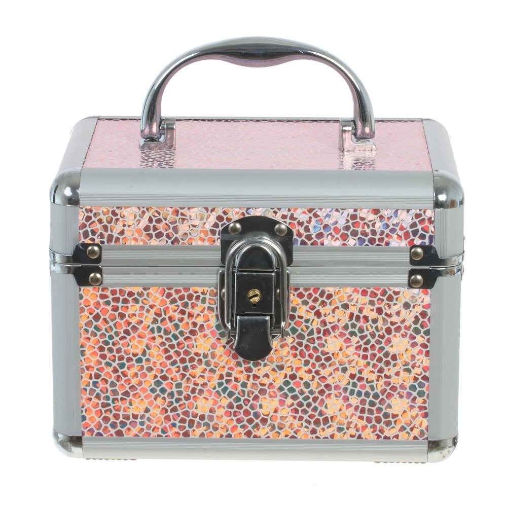 Шкатулка для украшений. На внутренней стороне крышки зеркало. Верхний уровень разделен на две секции, одна из которых с валиками для колец. Внутри шкатулка отделана тканью красного цвета, имеет замок с ключиком и ручку для удобства транспортировки.