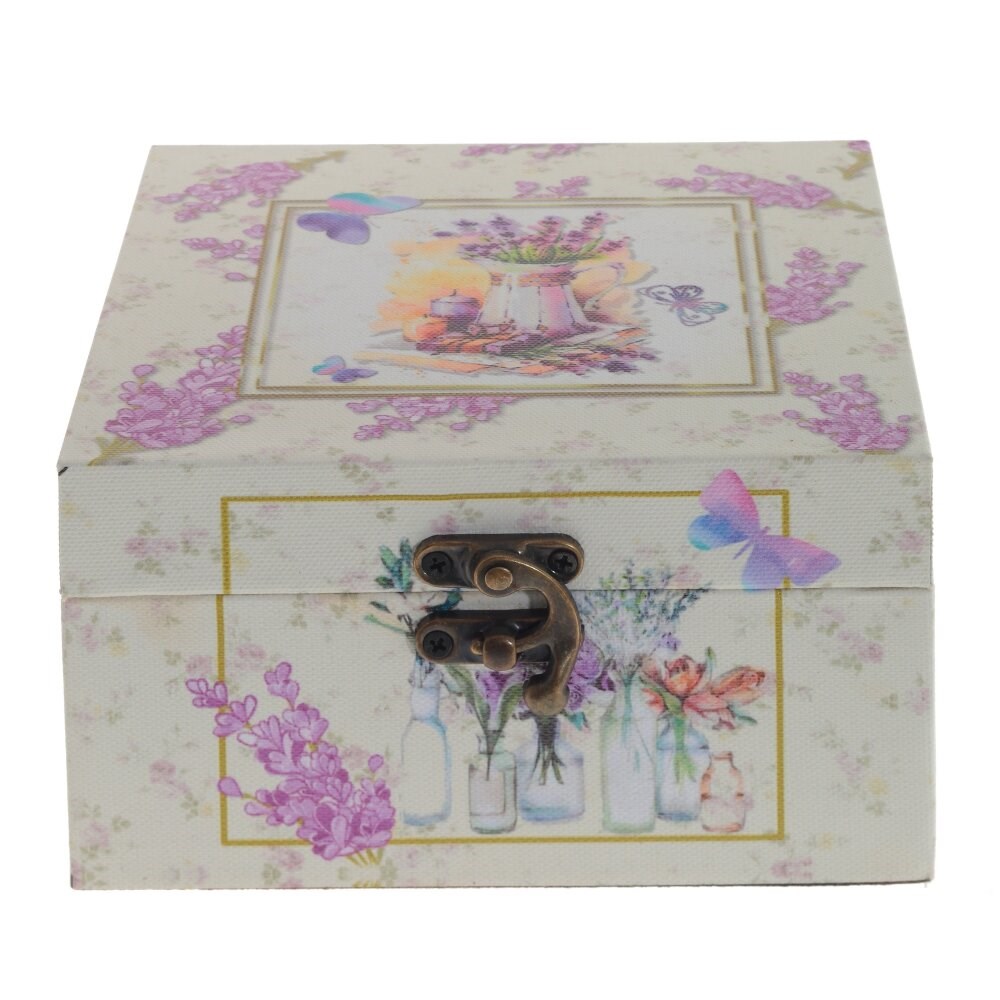 Шкатулка квадратной формы с откидной крышкой, с металлическим замком-защелкой, декорирована ярким рисунком.