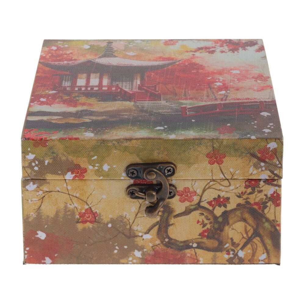 Шкатулка квадратной формы с откидной крышкой, с металлическим замком-защелкой, декорирована ярким рисунком.