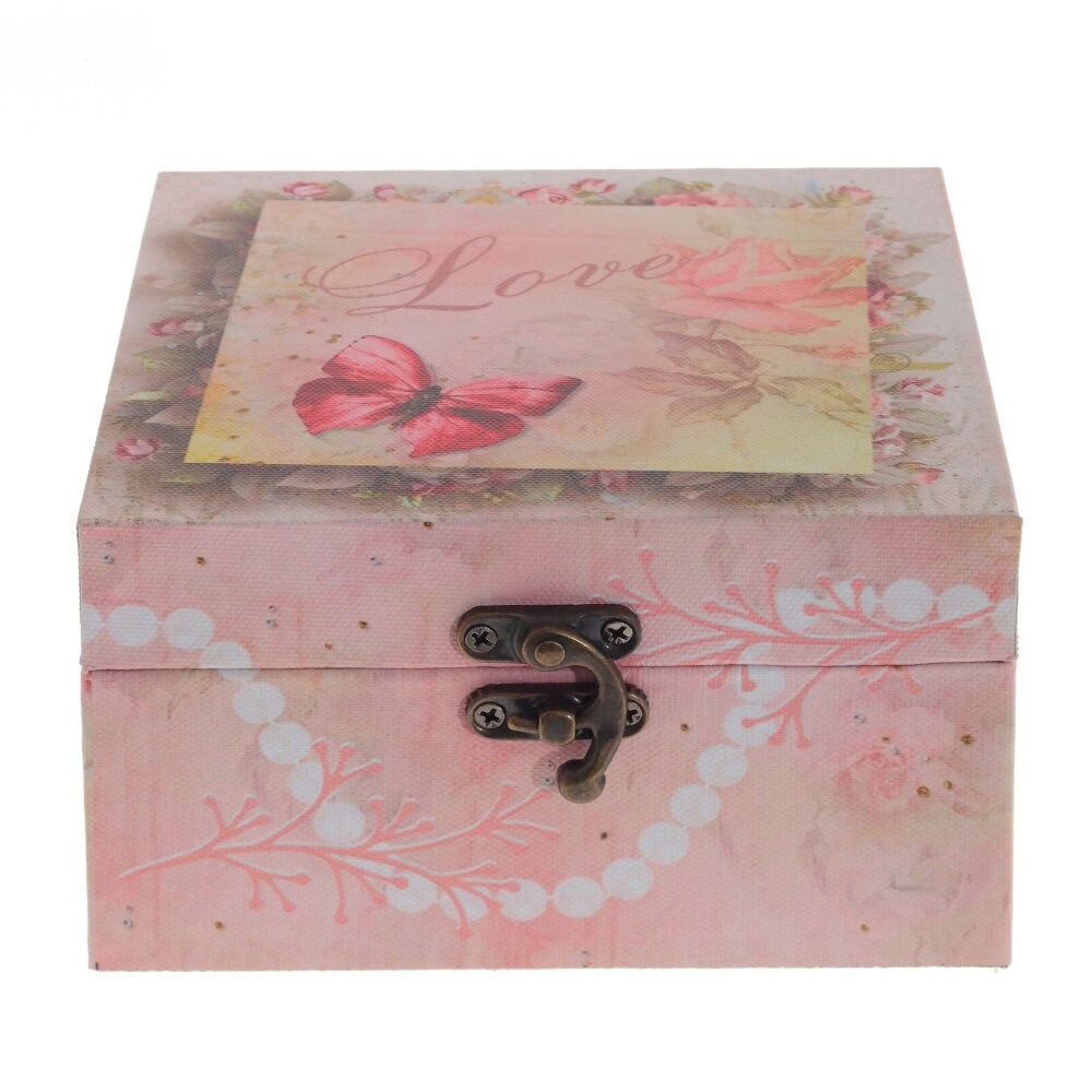 Шкатулка квадратной формы с откидной крышкой, с металлическим замком-защелкой, декорирована ярким рисунком.