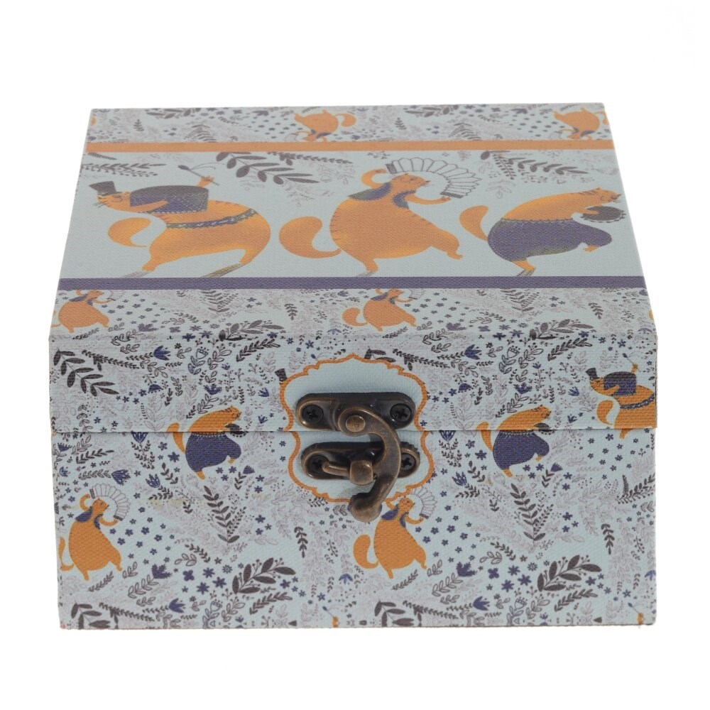 Шкатулка квадратной формы с откидной крышкой, с металлическим замком-защелкой, декорирована ярким рисунком.