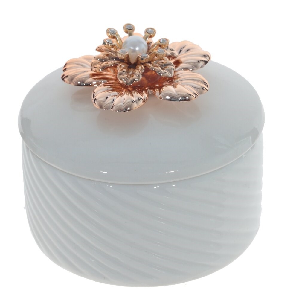 Современный дизайн шкатулки понравится ценителям красивых форм и изящных линий. Она создана из фарфора, в ней можно хранить не только украшения, а возможно и другие важные для вас вещи. Правильные формы и объемные золотые цветы на крышке делают дизайн оригинальным и привлекательным. Шкатулка может стать прекрасным подарком к празднику.