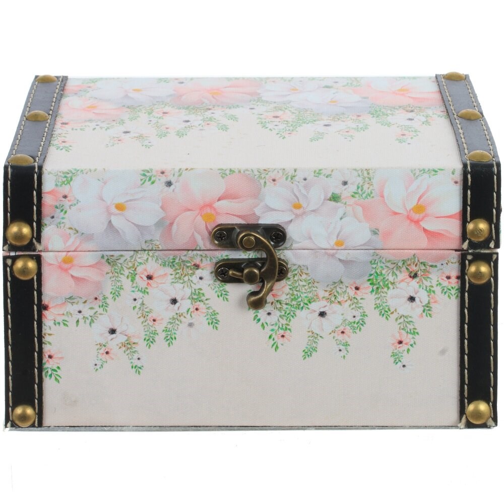 Шкатулка в форме сундука с откидной крышкой, с металлическим замком-защелкой, декорирована нежным цветочным рисунком. Модель имеет накладки с контрастной отстрочкой и заклепки.