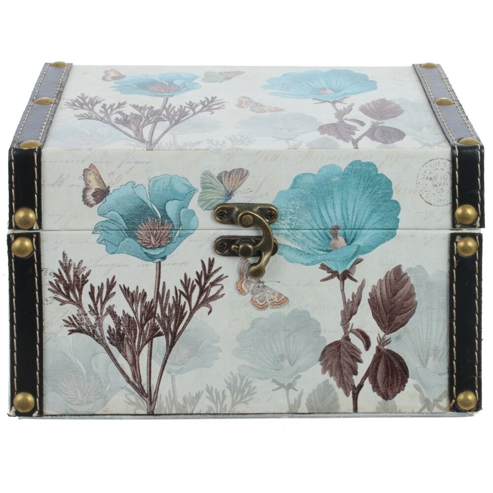 Шкатулка в форме сундука с откидной крышкой, с металлическим замком-защелкой, декорирована нежным цветочным рисунком. Модель имеет накладки с контрастной отстрочкой и заклепки.