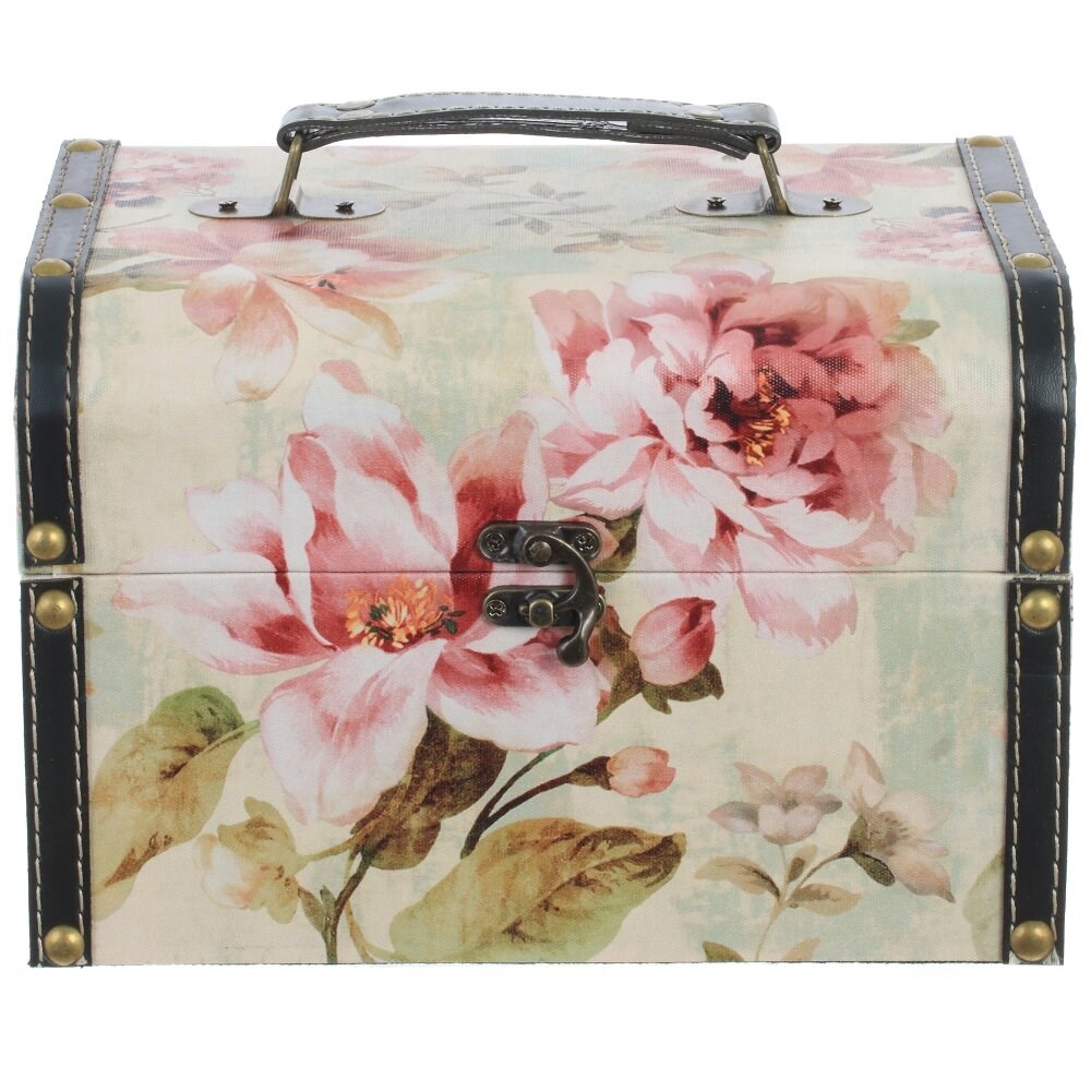 Шкатулка в форме сундука с откидной крышкой, с металлическим замком-защелкой, декорирована нежным цветочным рисунком. Модель имеет накладки с контрастной отстрочкой и заклепки, а так же удобную ручку.