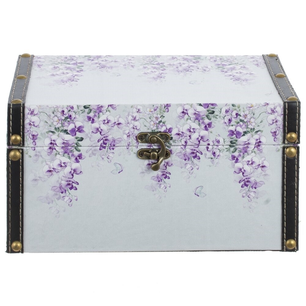 Шкатулка в форме сундука с откидной крышкой, с металлическим замком-защелкой, декорирована нежным цветочным рисунком. Модель имеет накладки с контрастной отстрочкой и заклепки.