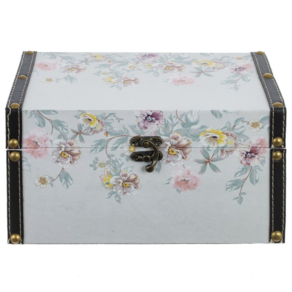 Шкатулка в форме сундука с откидной крышкой, с металлическим замком-защелкой, декорирована нежным цветочным рисунком. Модель имеет накладки с контрастной отстрочкой и заклепки.