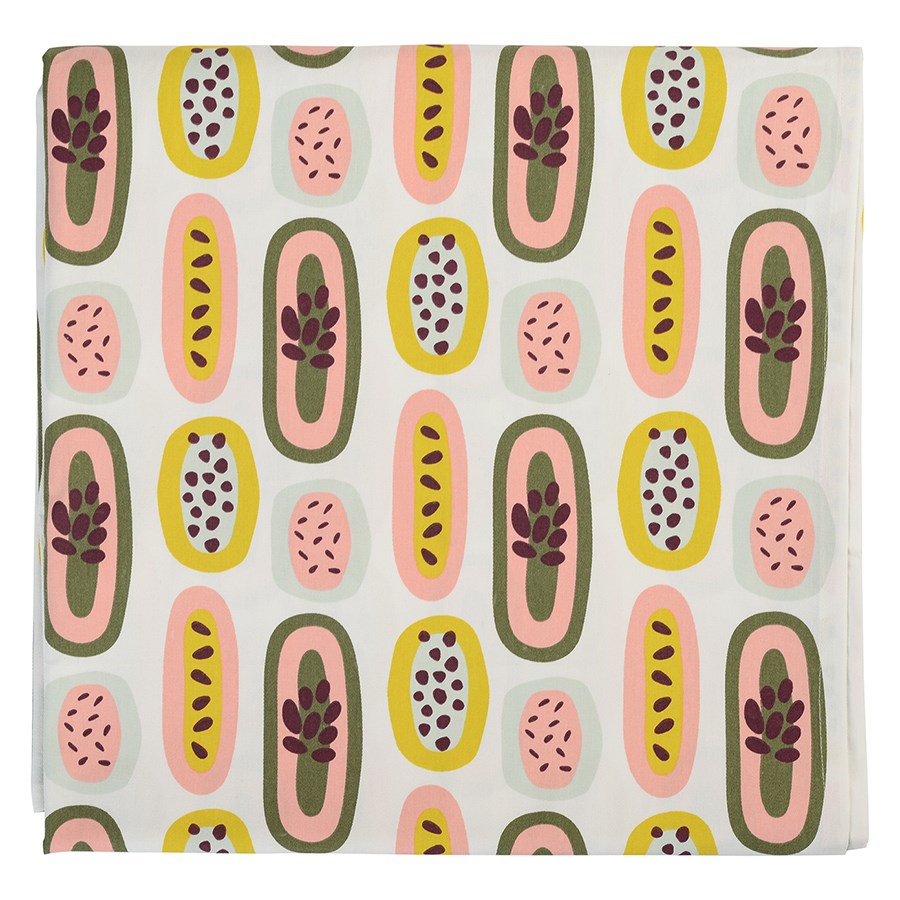 Скатерть на стол декорировали колоритным принтом Passion Fruit с тропическими мотивами. Модель выполнена из плотного прочного хлопка. Приятный на ощупь материал не вызывает аллергических реакций, и на нем не образуются катышки.Тип плетения: твил. Плотность ткани - 215GSM.