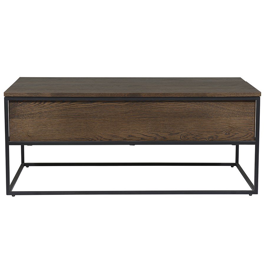 Дубовый кофейный столик на элегантных металлических ножках дополнит интерьер гостиной.