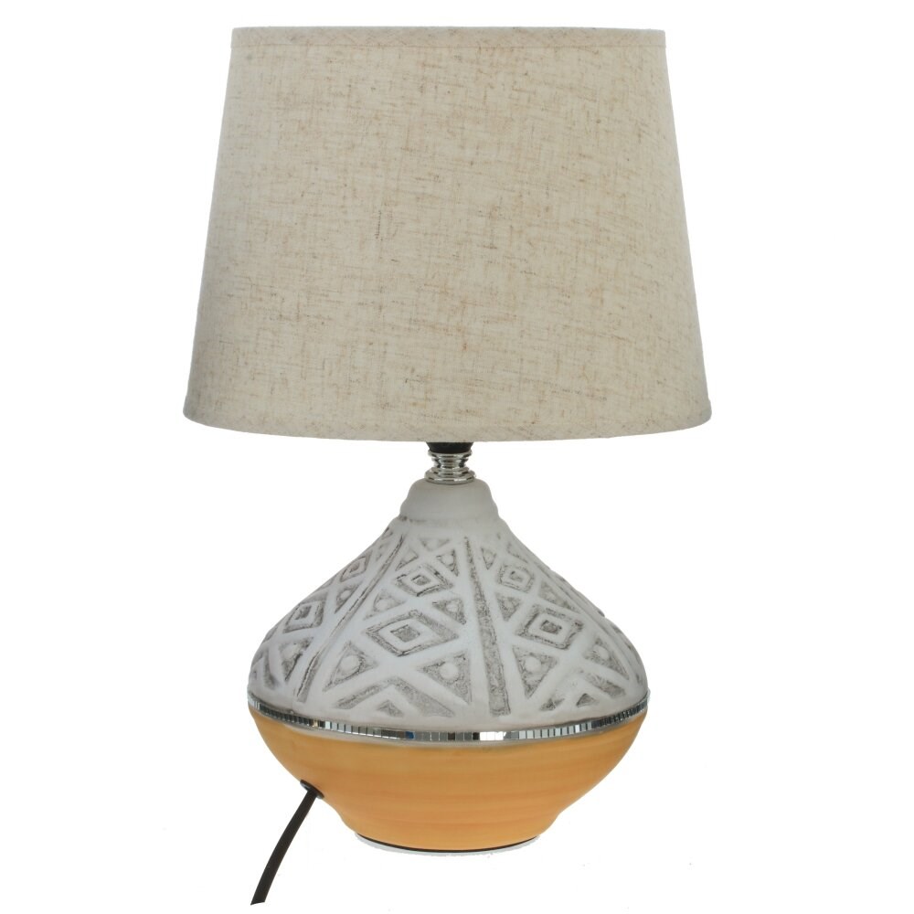 Светильник с оригинальным рельефным керамическим основанием и абажуром бежевого цвета будет радовать глаз своим великолепным дизайном. Идеально впишется в интерьер дома, а мягкий рассеянный свет создаст атмосферу уюта и комфорта. Оборудован патроном для цоколя E14 мощностью 60 Вт в количестве 1 шт. Лампа не входит в комплект поставки. Питание: от сети 220 вольт. Включение: шнур 1 м с выключателем.