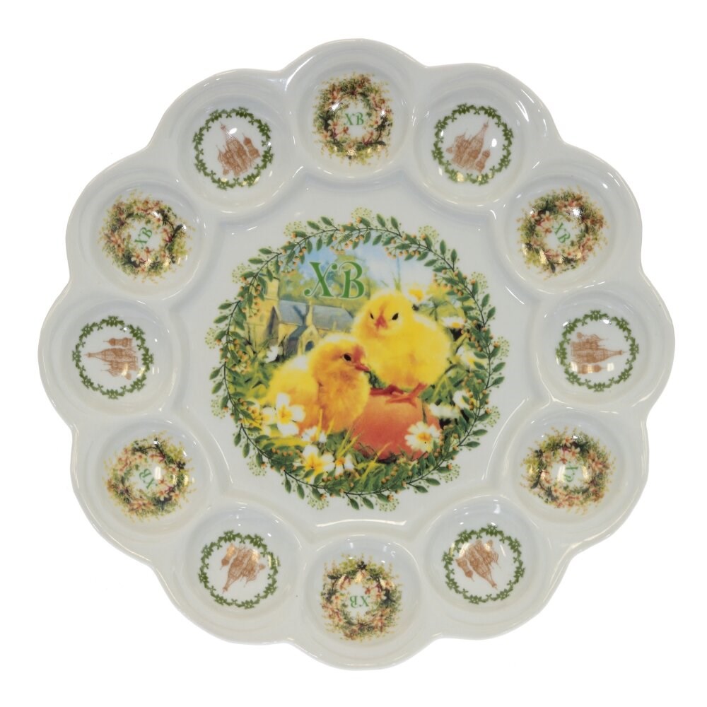 Очаровательная пасхальная тарелка с выемками для 12-ти яиц. В центре - место для установки кулича или творожной пасхи. Изготовлена из фарфора и украшена великолепным декором. Такая посуда несомненно украсит праздничный Пасхальный стол.