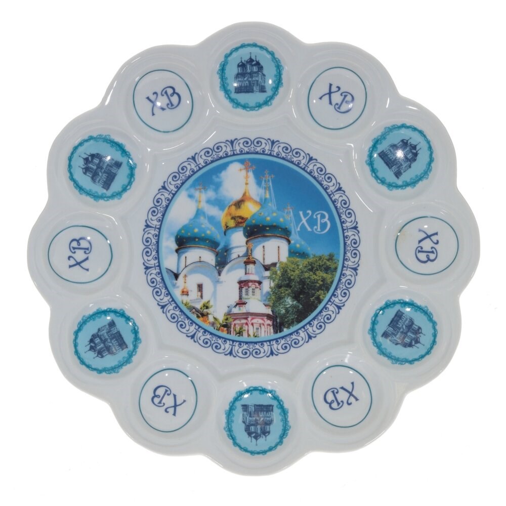 Очаровательная пасхальная тарелка с выемками для 12-ти яиц. В центре - место для установки кулича или творожной пасхи. Изготовлена из фарфора и украшена великолепным декором. Такая посуда несомненно украсит праздничный Пасхальный стол.