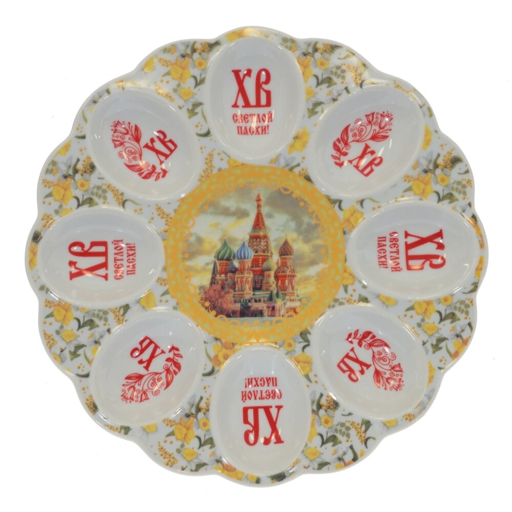 Очаровательная пасхальная тарелка с выемками для 8-ми яиц. В центре - место для установки кулича или творожной пасхи. Изготовлена из фарфора и украшена великолепным декором. Такая посуда несомненно украсит праздничный Пасхальный стол.