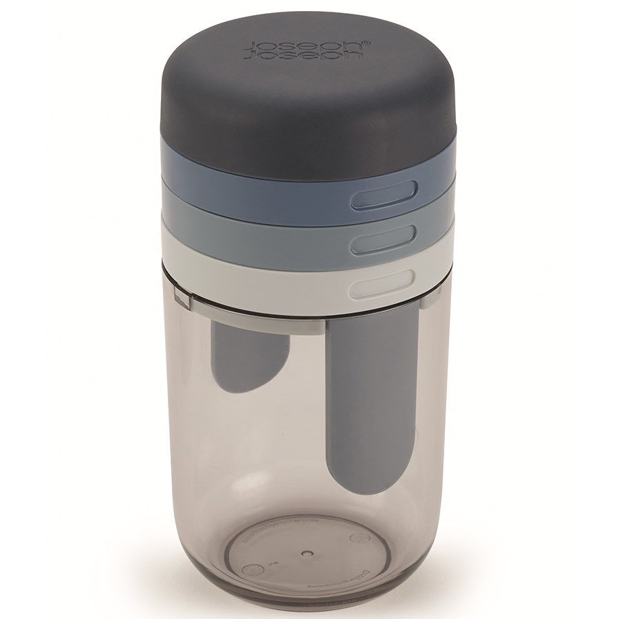 Все элементы соединяются в одном контейнере и занимают минимум места в ящике стола. Можно мыть в верхней части посудомоечной машины.