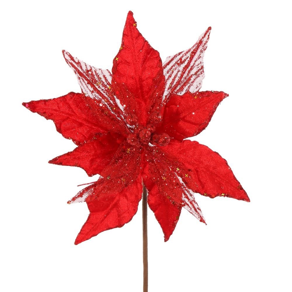 Искусственная пуансеттия смотрится очень волнующе, а усыпанные мелкими блестками лепестки сияют и переливаются от светящихся огоньков новогодней елки.