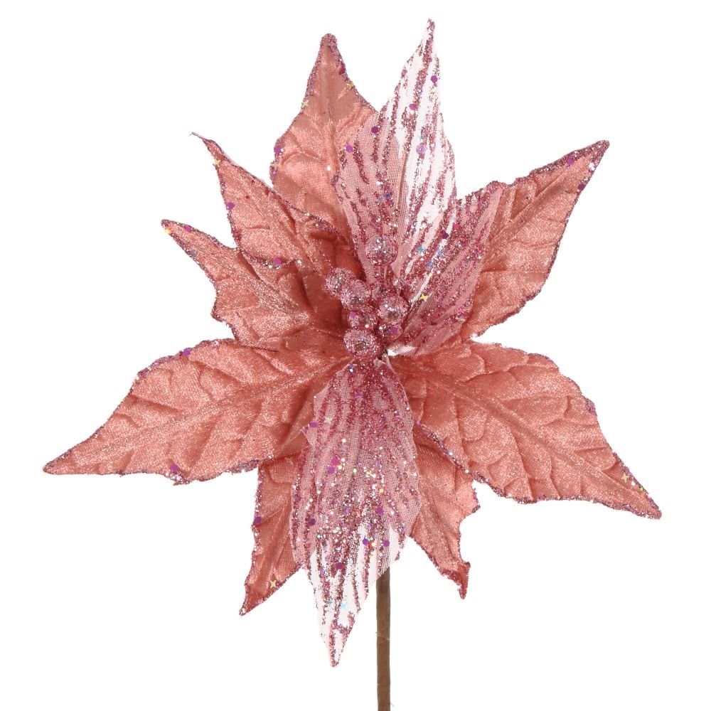 С ролью украшения новогодней ели прекрасно справится этот искусственный цветок. Пуансеттия пепельно-розового цвета. Благородность цвета подчеркивают блестки по краям и в середине.