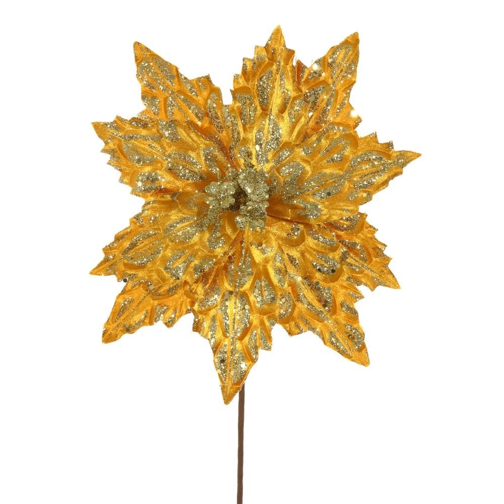 Искусственная пуансеттия смотрится очень волнующе, а усыпанные мелкими блестками лепестки сияют и переливаются от светящихся огоньков новогодней елки.