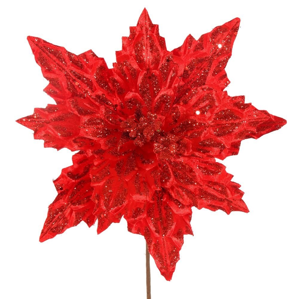 Рождественская пуансеттия. Лепестки выглядят невероятно эффектно: на их кончиках мерцает россыпь блесток, сердцевина состоит из бусинок. Прикрепите этот стильный новогодний цветок на елку и она заиграет яркими красками.