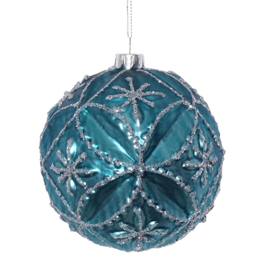 Новогодний голубой елочный шар со светлым узором, изготовлен из стекла