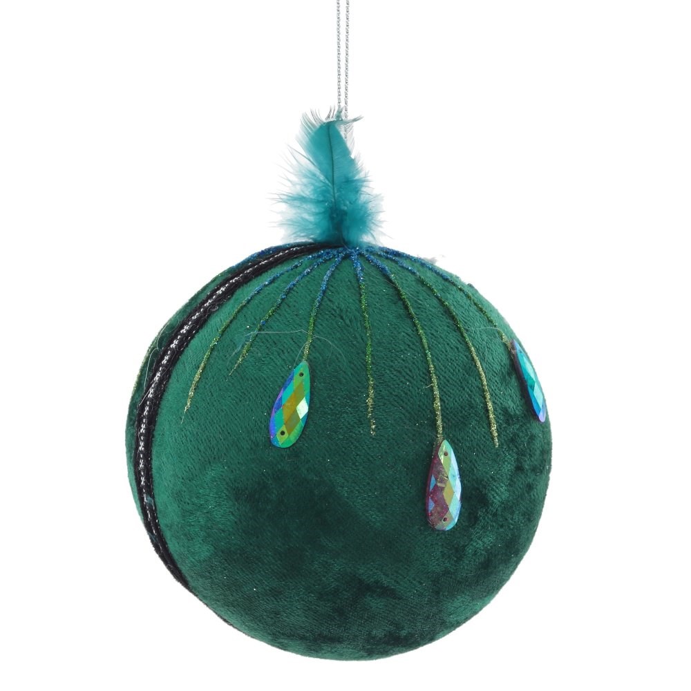 Новогодний шар с бархатным покрытием декорирован тесьмой и стразами. Это романтическое украшение придаст праздничной елочке выразительного шарма.