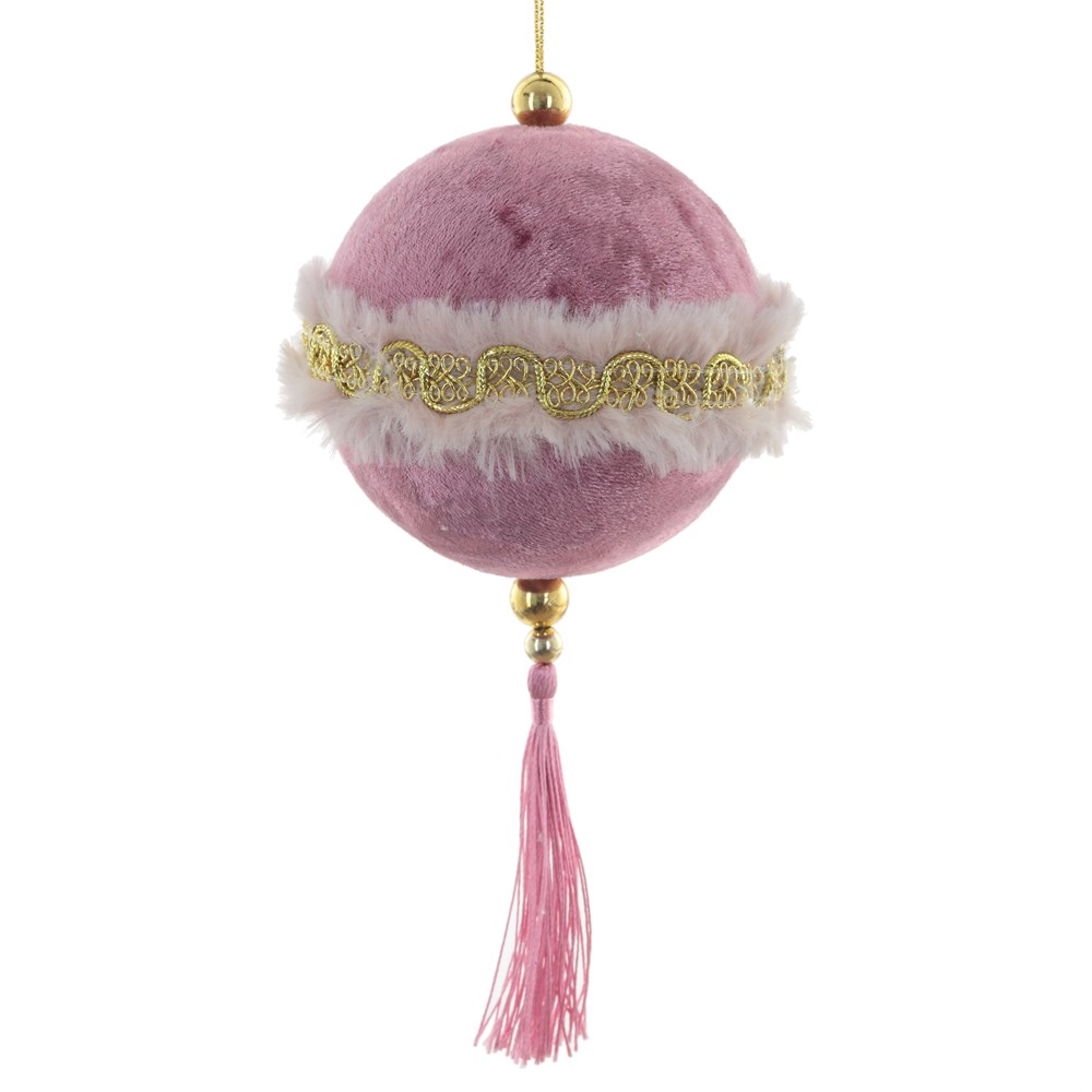 Новогодний шар с бархатным покрытием и кисточкой декорирован тесьмой. Это романтическое украшение придаст праздничной елочке выразительного шарма.