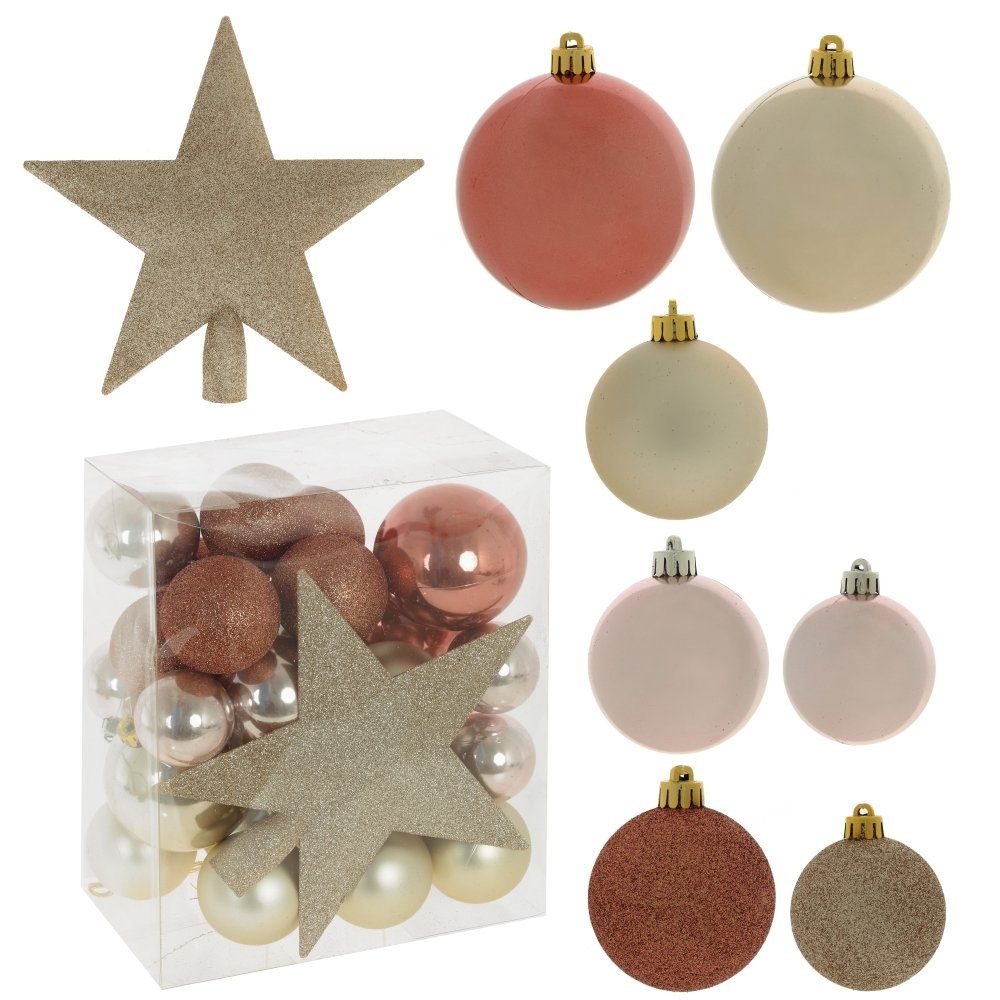 Украшение новогоднее "Шар и звезда", набор из 30 шт + 1 звезда, изготовлено из полимерных материалов. Размер: D20/8/6/5/4/3 см.. Набор из шаров разного оттенка розового цвета и звезда- верхушка помогут Вам очень быстро и красиво нарядить елку.