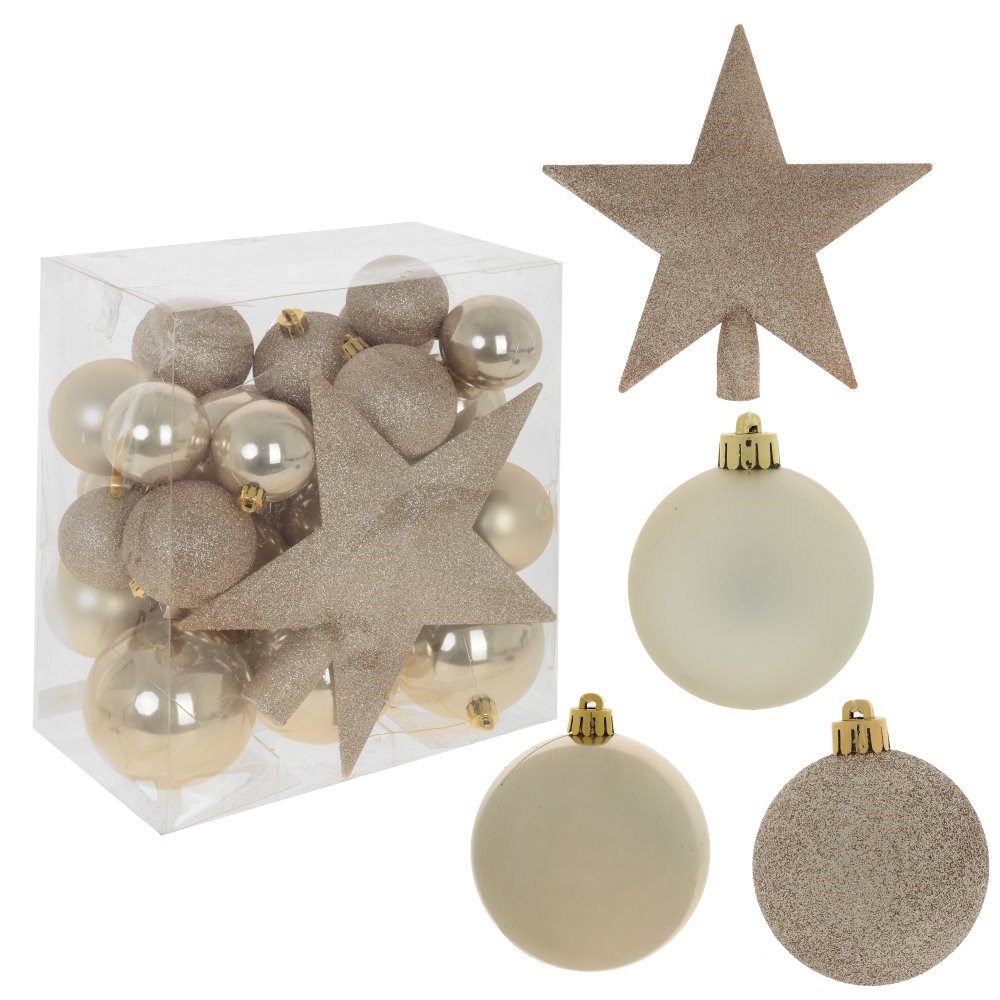 Украшение новогоднее "Шар и звезда", набор из 30 шт + 1 звезда, изготовлено из полимерных материалов. Размер: D20/8/6/5/4/3 см, упаковка-подарочная коробка.