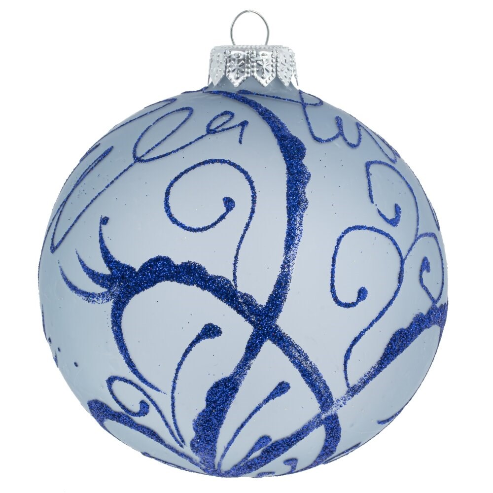 Шар выполнен из стекла и покорит сердца любителей эффекта «морозный узор». Игрушка нежно-голубого цвета украшена узором, словно нарисованным на окне самой природой. Он отлично украсит елку синего, белого и классического зеленого цветов.