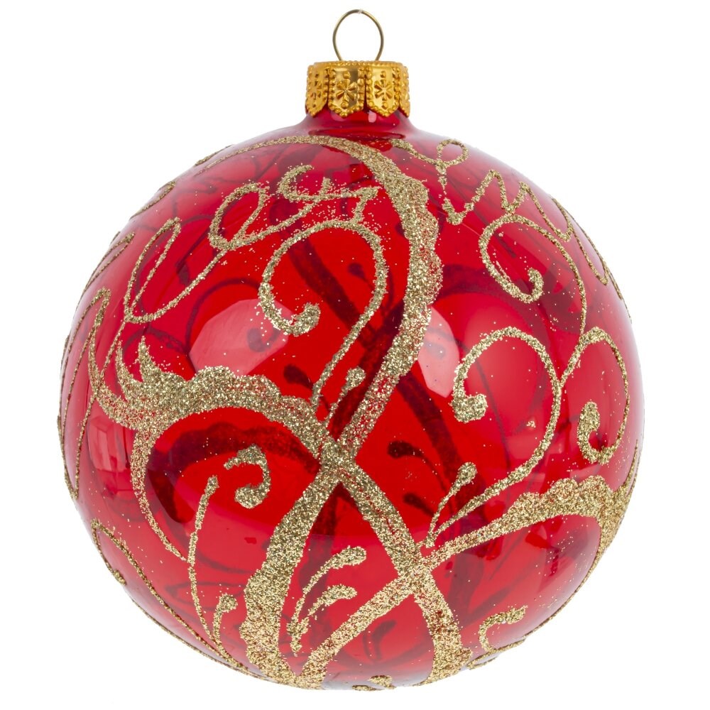 Вот готовое решение для украшения Вашей новогодней красавицы. Стеклянный прозрачный шар красного цвета, украшенный золотым узором, будет отлично смотреться на елочке .