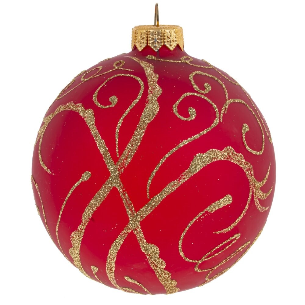 Вот готовое решение для украшения Вашей новогодней красавицы. Стеклянный матовый шар красного цвета, украшенный золотым узором, будет отлично смотреться на елочке .