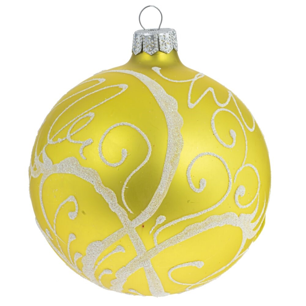 Шар выполнен из стекла и покорит сердца любителей эффекта «морозный узор». Игрушка нежно-желтого цвета украшена узором, словно нарисованным на окне самой природой. Он отлично украсит елку синего, белого и классического зеленого цветов.