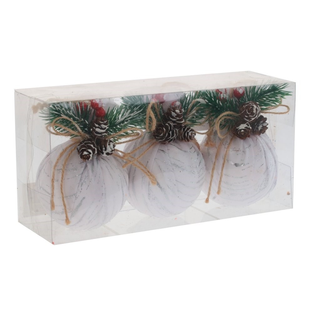 Набор из 3-х елочных игрушек в прозрачной пластиковой упаковке. Оригинальный шар обтянут тканью и декорирован искусственной хвойной веточкой с шишками. Внутри пенопластовая основа, что делает шар легким и небьющимся. Служит для украшения ёлочки и оформления праздничного интерьера.
