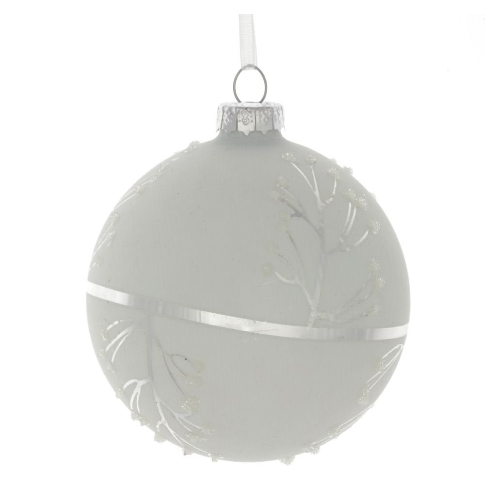Новогодний белоснежный елочный шар, украшенный нежными веточками, изготовлен из стекла