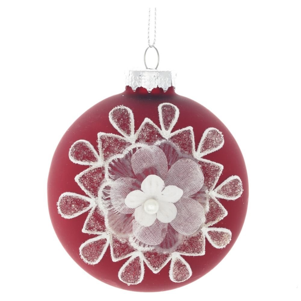 Новогодний красный елочный шар, украшенный натуральным кружевом, изготовлен из стекла